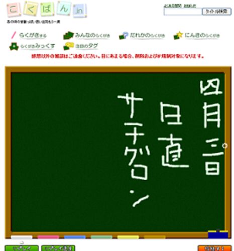 何か最近,話題が無いから「おもしろサイト」紹介しとく。一個目。こくばん.in黒板に落書き出来る☆チョークは6色から選べて,ホントに黒板に書いたみたいな音がする。チョークの粉が落ちる感じも本物ソックリヽ(´∀`*)ノもちろん修正は黒板消しでっ!書いたものはブログに…