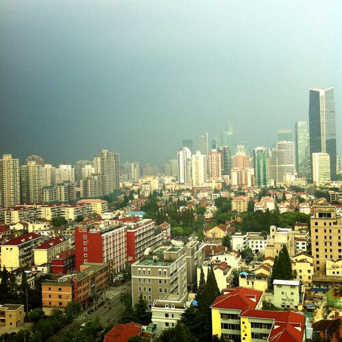 北(左側)から雨雲接近中。 もぅ間も無くスコール開始。 ↑から10分。 スコール&雷開始。 あっという間に真っ暗。これぞ上海の夏☆