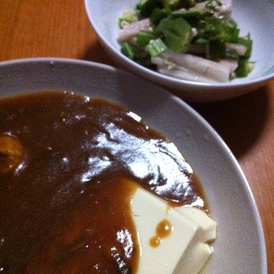 今晩はカレー豆腐+山芋短冊オクラ。